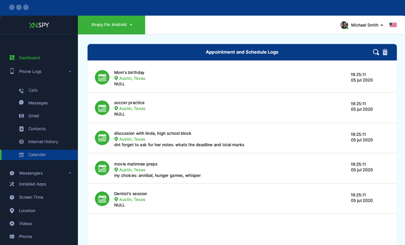 対象の電話またはタブレットに保存されているすべてのカレンダー エントリ、予定、メモ、およびスケジュールを次に示します。すべての予定をその場所の統計とともに表示できます。各カレンダー エントリの日付とタイム スタンプを表示することもできます。
