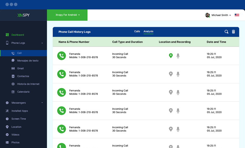 ここで、対象デバイスの通話履歴のリストを表示できます。発信者の名前と番号、および各通話の時刻と日付のスタンプを監視できます。