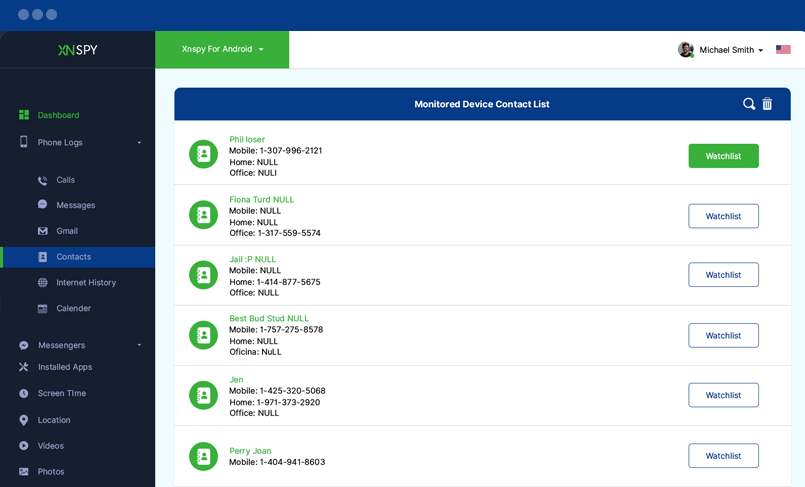 これは、保存された各連絡先の名前と番号を含むターゲット デバイスの連絡先リストです。連絡先の横にある [ウォッチリスト] ボタンをクリックすると、その連絡先をウォッチリストの連絡先に追加して、関連するアクティビティの即時アラートを受け取ることができます。