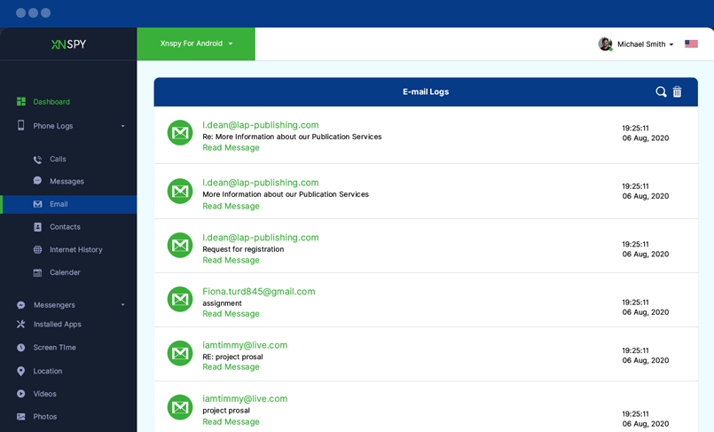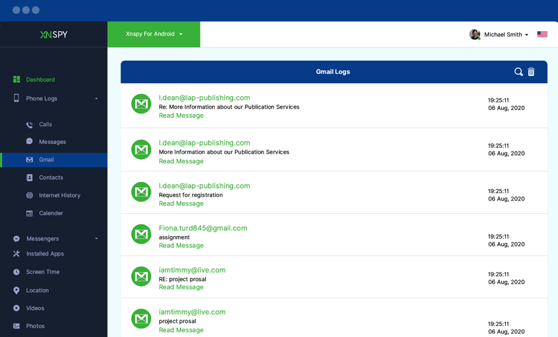 ターゲットデバイスで送受信されたすべての電子メールは次のとおりです。すべての電子メールを読むことができ、すべての連絡先の電子メール ID を時刻と日付のスタンプと共に表示できます。