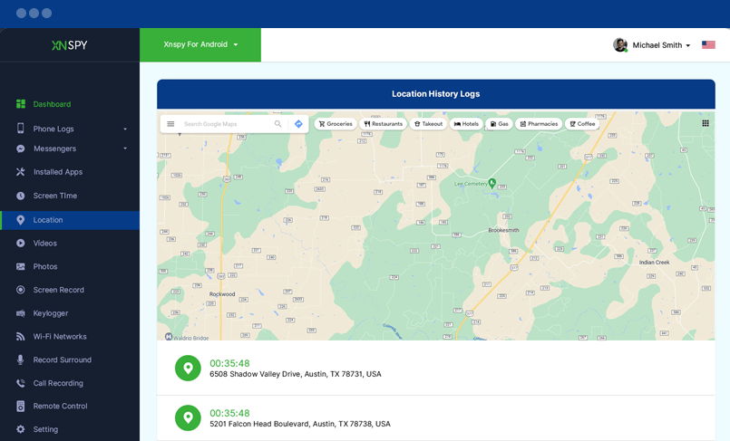 監視対象ユーザーが訪問したすべての場所を表示できます。マップ上のポインターは、ターゲット デバイス ホルダーが訪れた場所を示します。ポインターをクリックすると、それらの場所の住所が表示されます。また、各訪問の日時を監視することもできます。