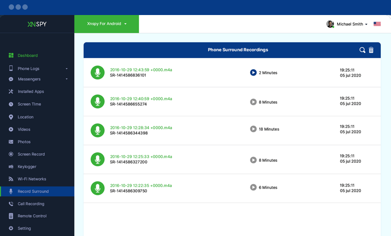 これは、ターゲット デバイス周辺のすべての記録のリストです。録音をクリックすると、すべての録音を聞くことができます。各録画の日時スタンプを表示できます。録画機能をリモートで有効にするには、左側のリモート コントロール タブをクリックします。