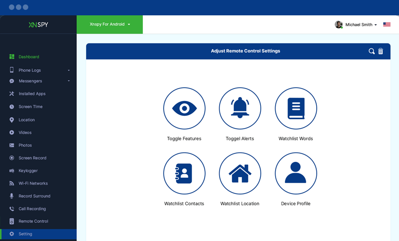 ここでは、以下のセクションから選択して、さまざまな XNSPY 機能の設定を調整できます。機能とアクティブなデバイス プロファイルを表示および編集します。