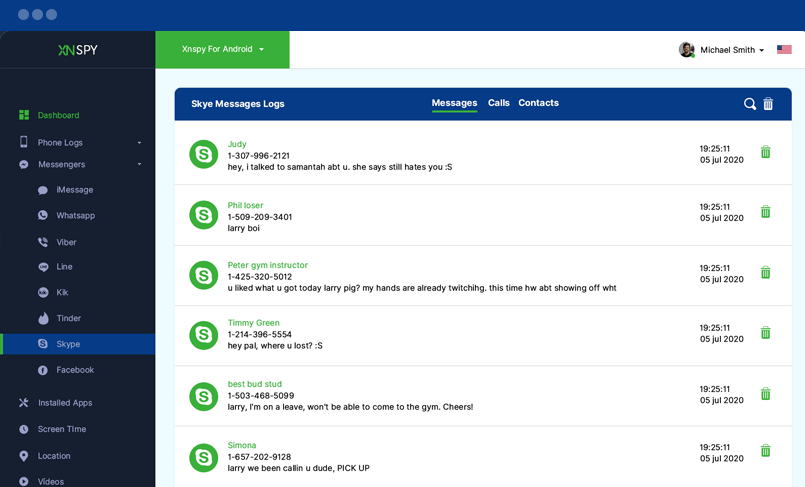 Skype の連絡先とログはこちらで確認できます。それぞれのタブをクリックして、Skype の連絡先、通話、チャットを監視します。各通話とメッセージの Skype ID と時刻と日付のスタンプを表示することもできます。